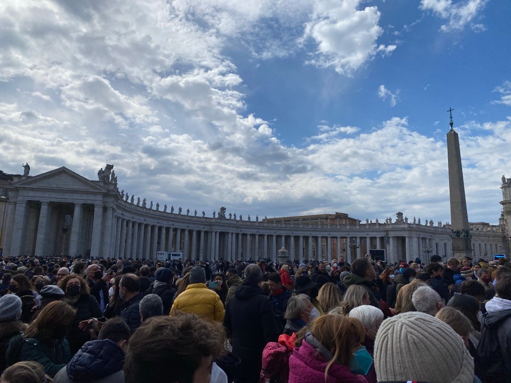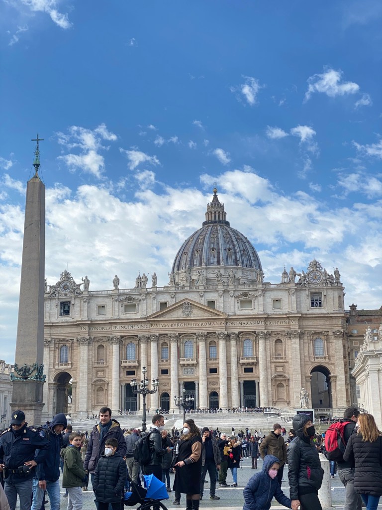 Après ce début de journée plutôt très gourmand, nous nous dirigeons vers le Vatican… nous n’avions absolument pas anticipé la foule! Ce n’est donc pas un mythe, le monde répond toujours présent dans l’Etat le plus petit du monde (la population y est seulement de 830 personnes environ). Là encore, la file d’attente est le maître mot de bien des monuments à commencer par la Basilique Saint Pierre. Nous nous contentons de l’admirer de l’extérieur et notre vue est donc déjà grandiose.