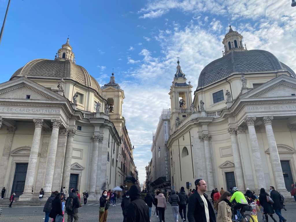 Nous arrivons ensuite à la Piazza del Popolo (« Place du Peuple ») sur laquelle sont érigées deux églises baroques complètement identiques.
