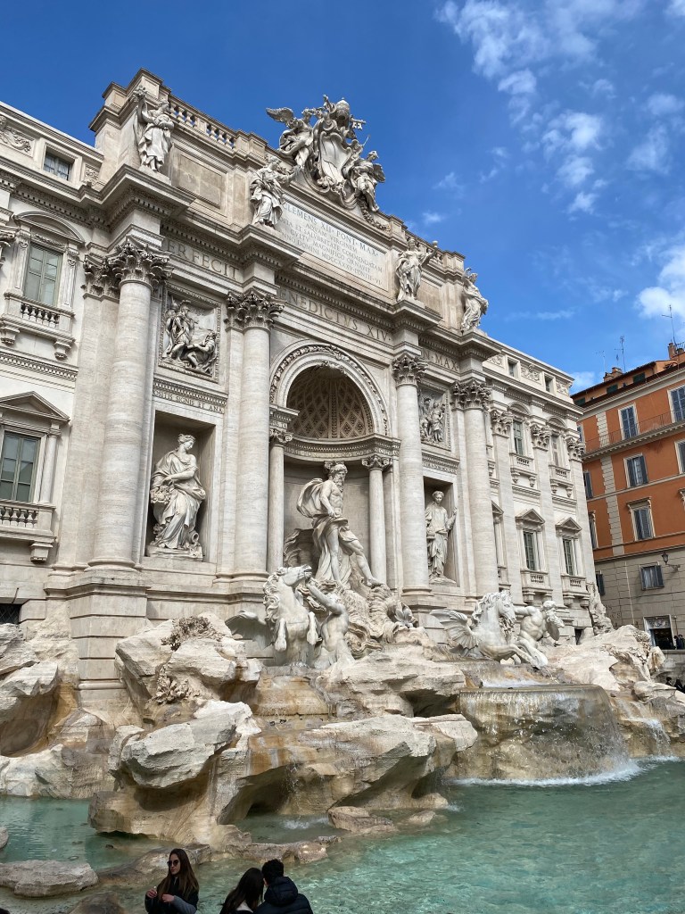 Nous ne dérogeons évidemment pas à la règle et jetons tour à tour notre pièce (dans la main droite, par dessus l’épaule gauche). Cette tradition remonte à 1954, dans le film « La Fontaine des Amours »: en jetant une pièce dans la fontaine, on s’assure ainsi de revenir un jour à Rome. Les dons récoltés chaque jour sont d’ailleurs reversés à une association caritative catholique.
