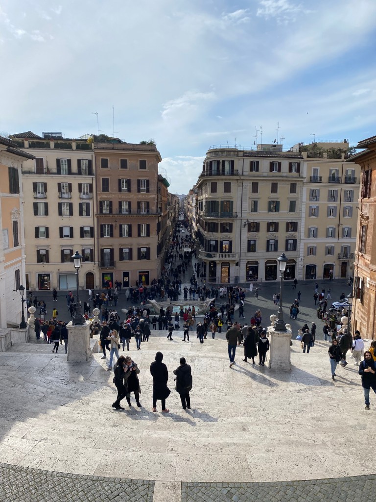 Nous continuons ensuite de vadrouiller dans la ville et notamment dans le quartier Campo Marzio: nous découvrons la Piazza di Spagna (« Place d’Espagne »), tirant son nom de la proximité de l’ambassade d’Espagne. Ses escaliers sont très connus car ils permettent d’avoir une jolie vue sur la ville. Le quartier est également connu pour ses nombreuses boutiques de luxe.