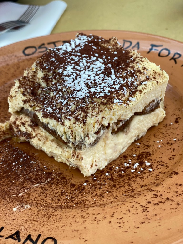 Il s’agissait du restaurant Osteria Da Fortunata (voici leur page ici) pour lequel la réservation n’est pas nécessaire mais la patience, elle, sera donc requise. Au menu, pâtes amatriciana (sauce tomate, lard fumé ou guanciale, parmesan) pour ma part, pâtes on ne peut plus locales car on voit les petites mains les confectionner à l’intérieur du restaurant. J’adore cet artisanat! Mon Amoureux opte pour les gnocchis alla sorrentina (sauce tomate, mozzarella, parmesan, basilic). Pour clôturer ce déjeuner 100% traditionnel, rien de tel qu’un excellent tiramisu.