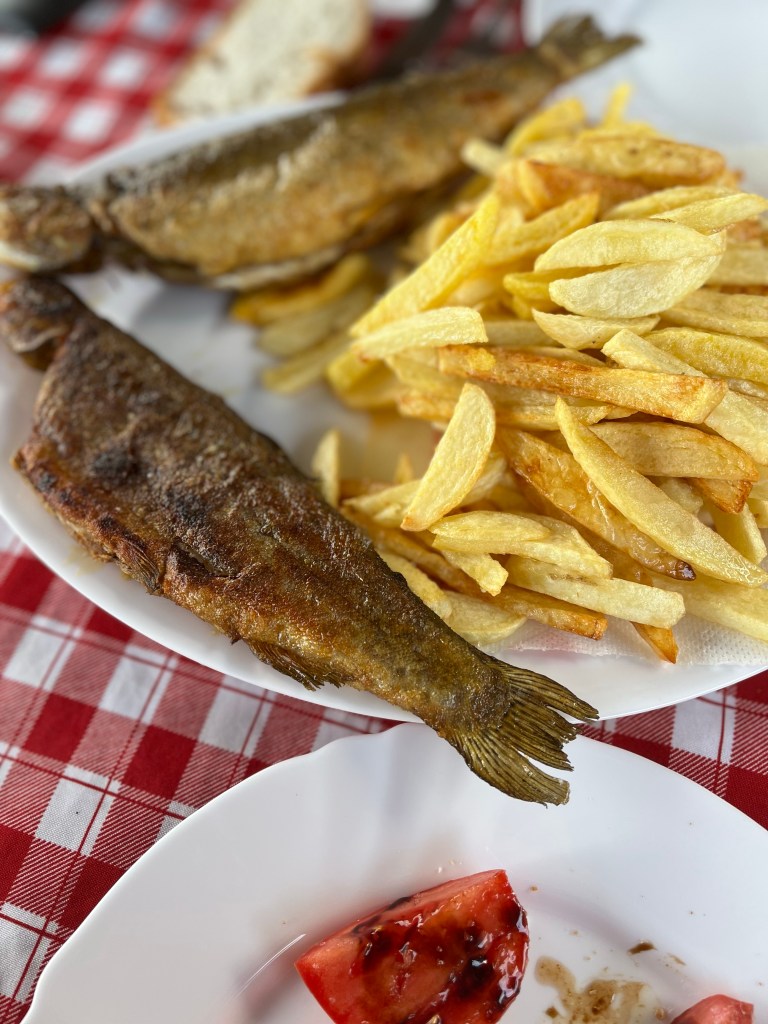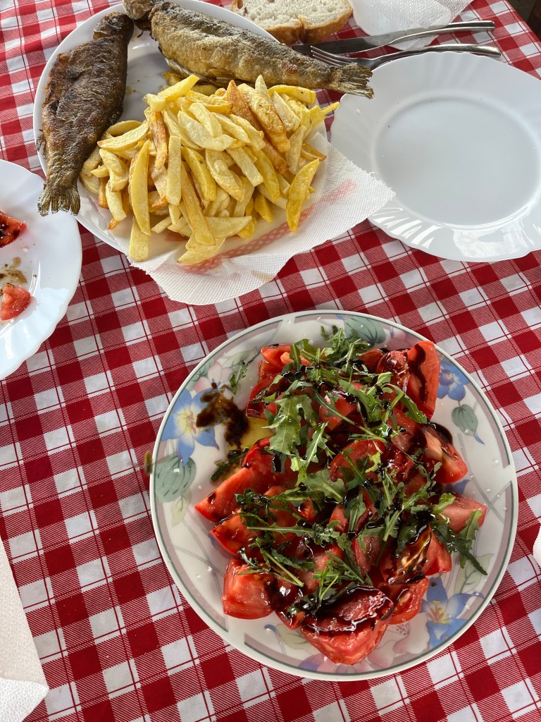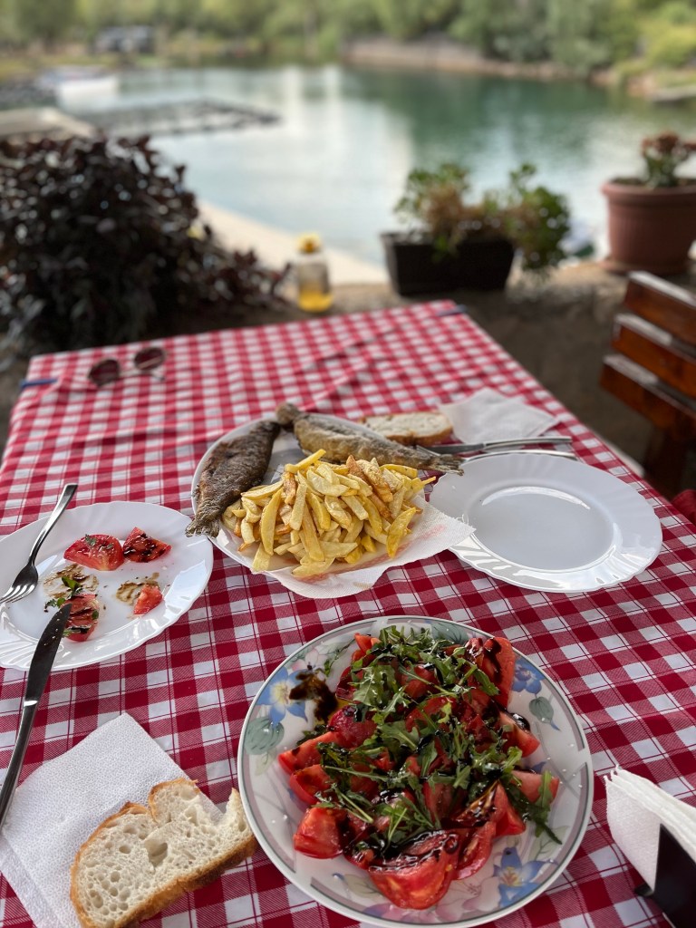 Quelques clichés plus tard, nous nous rendons dans un village tout près d’ici, nommé Karuc. Très vite nous constatons que celui-ci est tout petit et que malgré sa situation au bord du lac, il n’y a pas grand chose à faire. Pourtant, je repère un homme âgé en train de faire des mots fléchés sur sa terrasse et suis convaincue qu’il doit bien proposer le déjeuner. En effet! Au menu, truite pêchée par lui-même quelques heures/jours auparavant, tomates de son jardin et frites maison. C’était authentique, c’était simple, c’était beau. Là encore un merveilleux souvenir car nous avons vraiment eu l’impression de manger chez « notre Papy ».