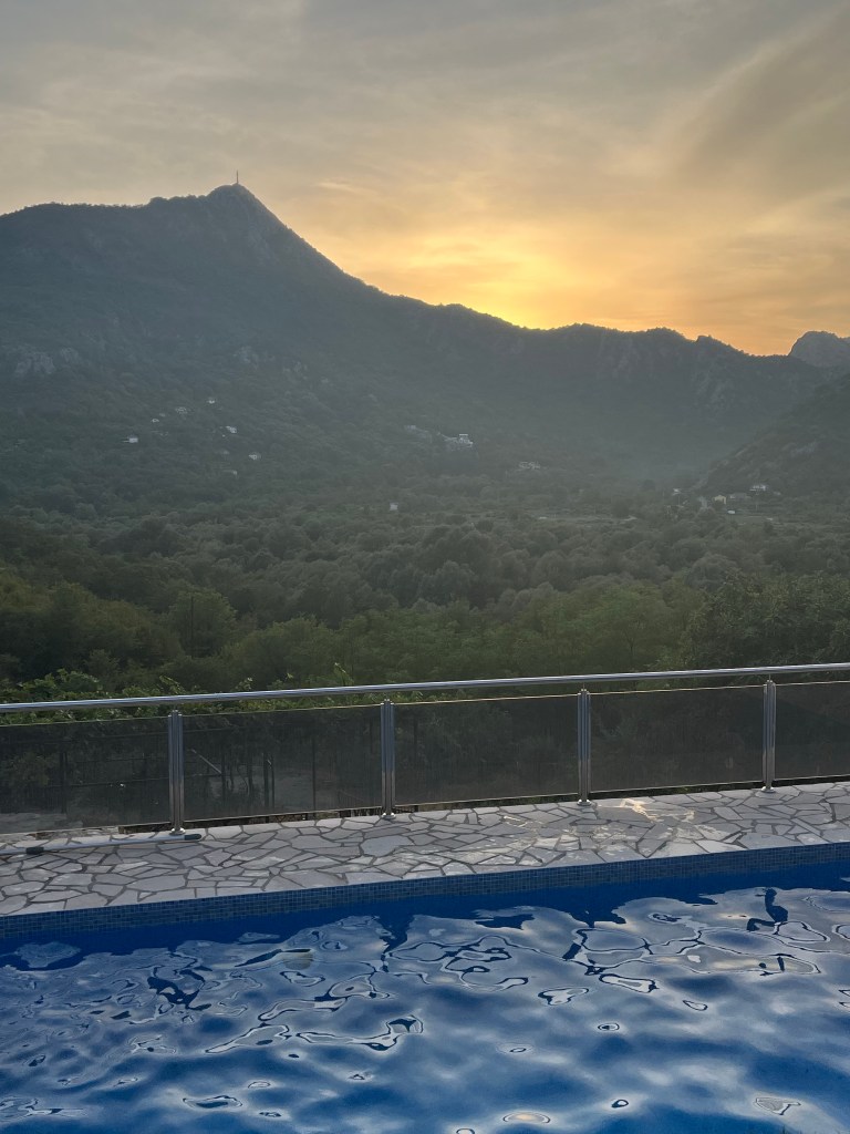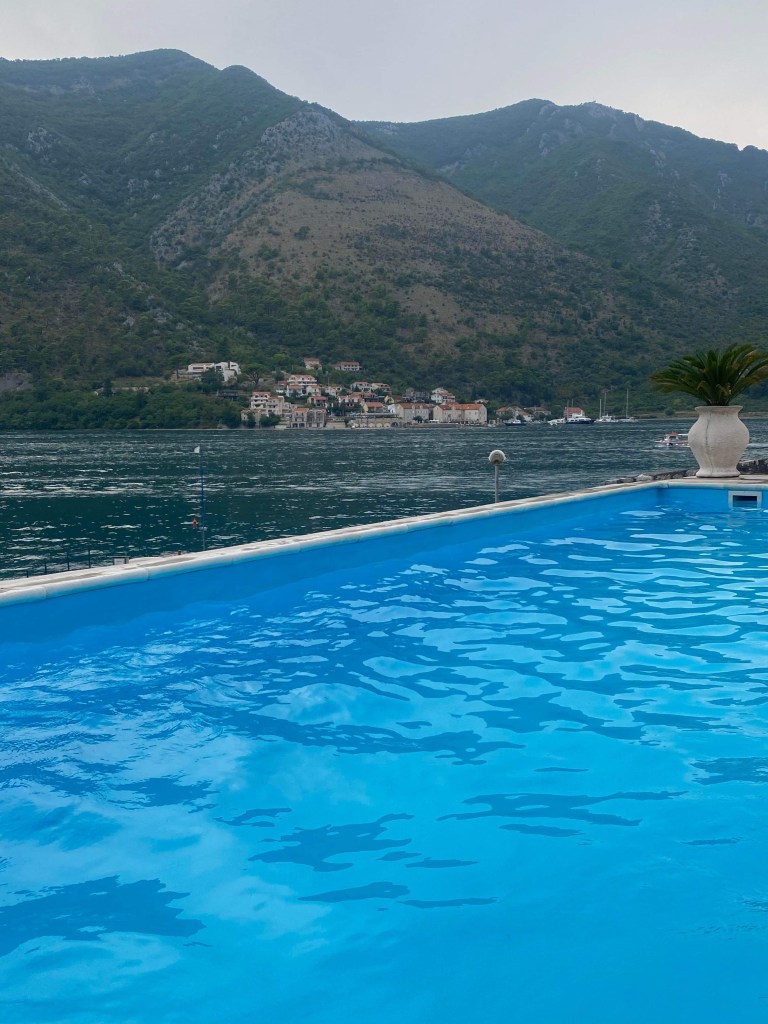 Après cette excursion fort appréciable, nous nous rendons à notre premier hébergement, dans le village juste après Kotor, à Dobrota. J’ai effectué toutes mes réservations via Booking et tous les logements étaient parfaits. Ici, nous avions un studio dans un petit établissement géré par une Maman et son fils. Je recommande vivement ce lieu, idéalement situé et dont la piscine avec vue sur la mer ne vous laissera pas indifférent(e). Encore moins aux couchers de soleil! Voici le lien.