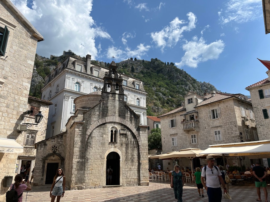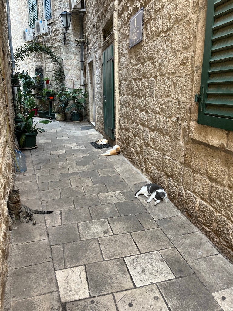 Nous nous perdons ensuite dans le dédale des rues de Kotor… L’architecture en pierre rend le village vraiment charmant. Vous n’y trouverez pas moins de 10 églises et de nombreux chats … Il y a longtemps, alors que la peste frappait la ville, de nombreux rats étaient présents. Les chats de gouttière ont commencé à arriver et les ont chassés avant d’y élire domicile et d’y rester.