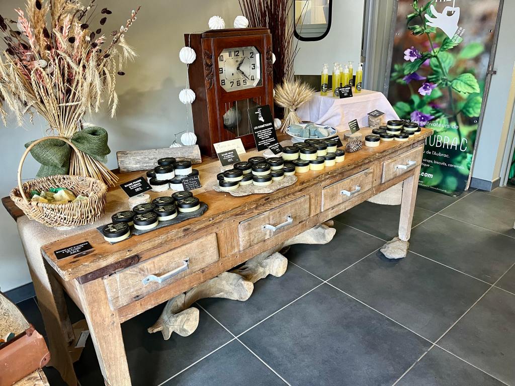 On y trouve des artisans, des brocanteurs, des petites boutiques,… Nous avons d’ailleurs beaucoup aimé la Fleuriste « Atelier Flordalis« , une jeune femme reconvertie qui vend, certes, des fleurs mais aussi des produits de créateurs de la région: des bijoux avec des fleurs d’Aubrac, des savons, etc. De l’artisanat comme on aime!