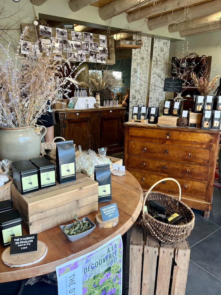 Je recommande vivement de passer par la Grange au Thé pour découvrir un savoir-faire vraiment local: il s’agit d’une association créée par des locaux, cultivateurs de thé d’Aubrac. Dans leur jardin, ils font pousser du Calament à grandes fleurs, le font sécher et le valorise en différents produits, le plus connu étant ce fameux Thé d’Aubrac qui, d’ailleurs ne contient pas de théine. Une tisane, quoi… et c’est très bon!