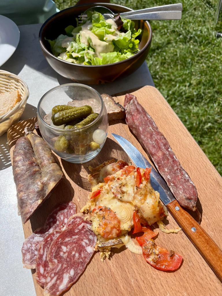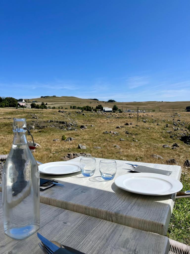 Nous avons déjeuné à l’extérieur avec pour panorama une vue à 360 sur l’Aubrac, ses plateaux et ses vaches … c’était magnifique.